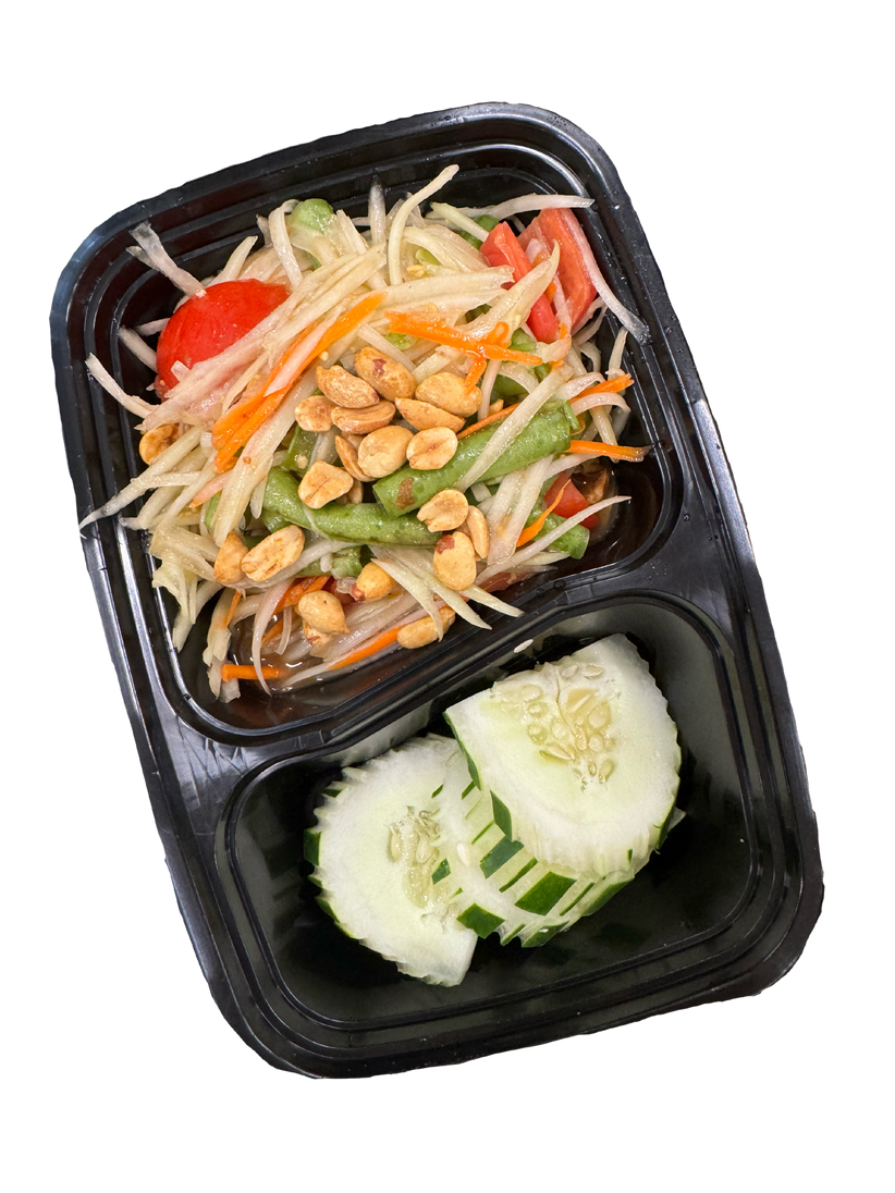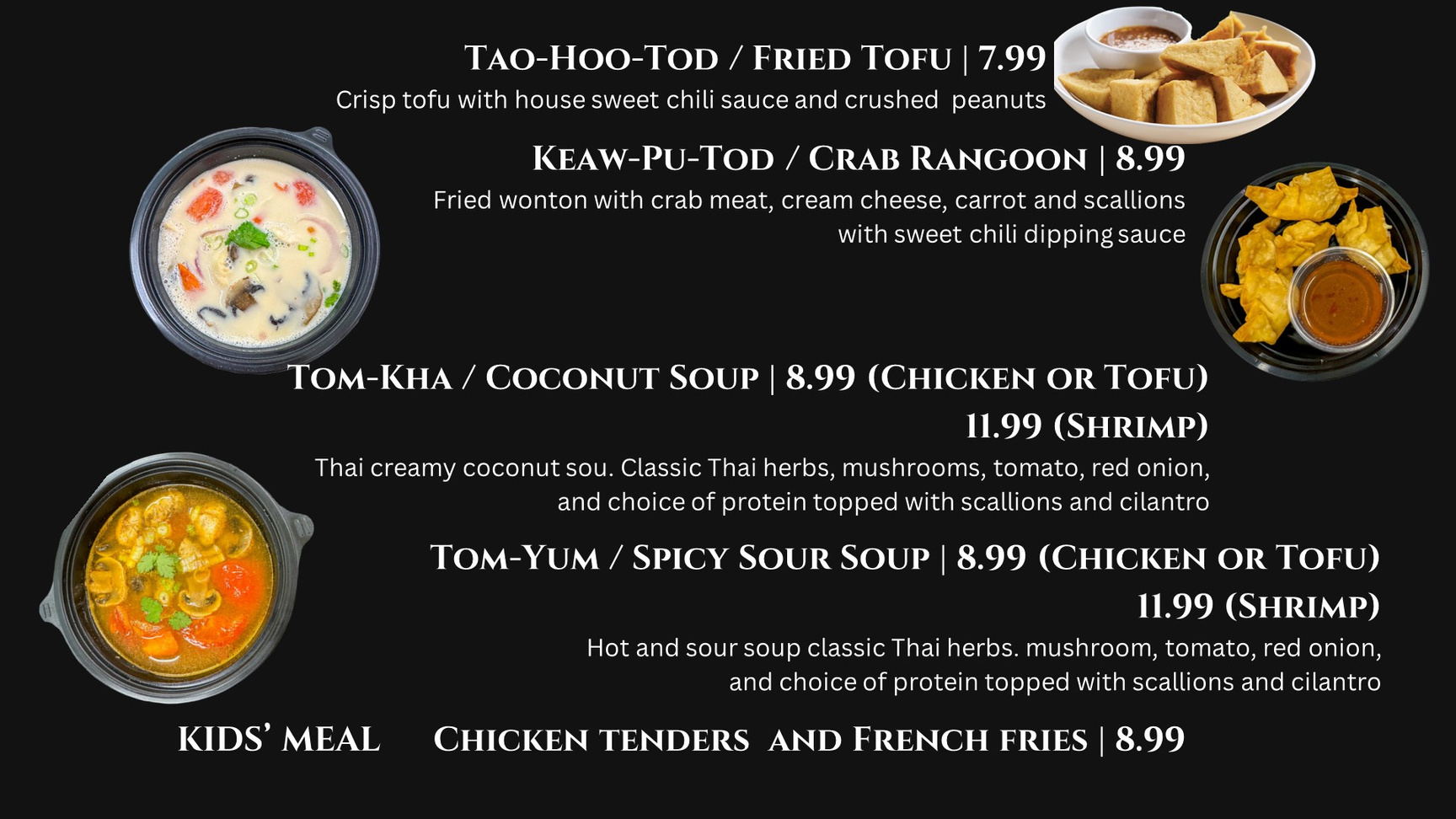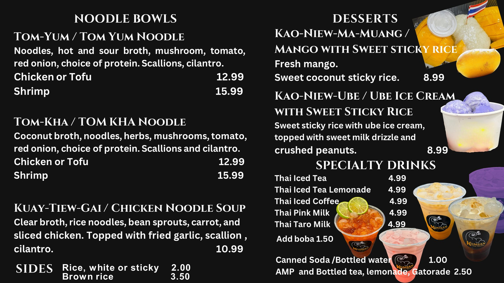 This authentic Thai kitchen was born out of love for a magnificent country and culture with some of the best food on earth! Connor was a Rotary Youth Exchange Student who traveled as a teenager for a life changing immersion year in Thailand in 2009-10. It was there that he was given his nickname, Komsan. In his adopted host town of Laem Chabang, Chonburi province, he met the love of his life, the petite but intrepid Pintira.Their relationship flourished over the years, with many a trip back and forth but never a lessening of Connor’s love of all things Thai, or Pintira’s adventurousness and fondness for America. Pintira grew up in a traditional Thai household where she cultivated her love of cooking in the family home. Having graduated from Burapha University in Bang Saen, Pintira eventually came to Jacksonville for keeps in 2018. Komsan and Pintira were married and shared a dream that came into being with the opening of Komsan’s Thai Kitchen. With its mission to serve fresh, authentic cooking, Komsan’s purpose is to bring the lusciousness of Thai food to all, from those craving nostalgic dishes from the Land of Smiles, to the initiate just beginning to explore the balance of flavors unique to this delectable cuisine. Please join in sampling the culinary treasures of a distant land, served to you right here in the heart of Jacksonville! ขอบคุณ!